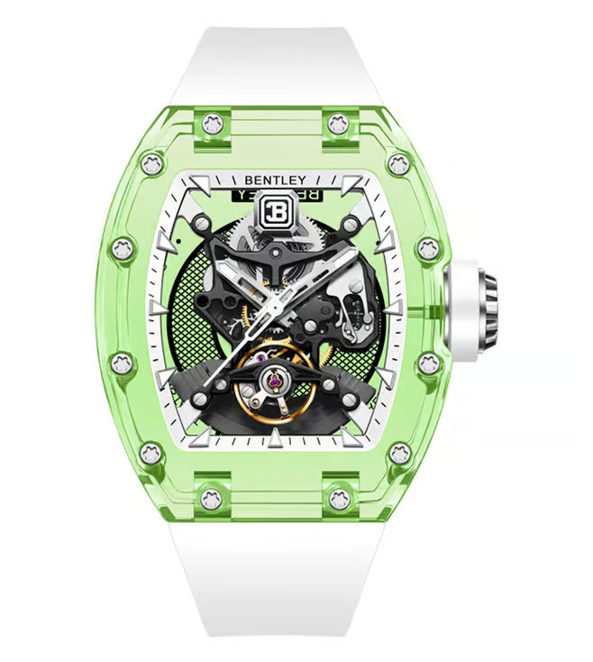 Introducing a masterpiece of contemporary horology, this exceptional timepiece from Bentley exudes refined elegance and modern engineering. Encased in a striking translucent green casing, it beautifully frames a skeletonized dial that reveals the artistry of its intricate inner workings. At its heart beats the precision engineered Automatic BX7885 Movement, delivering seamless performance with every passing moment. The open worked dial, adorned with bold indices and meticulously crafted bridges, offers a mesmerizing view of its mechanical ballet.